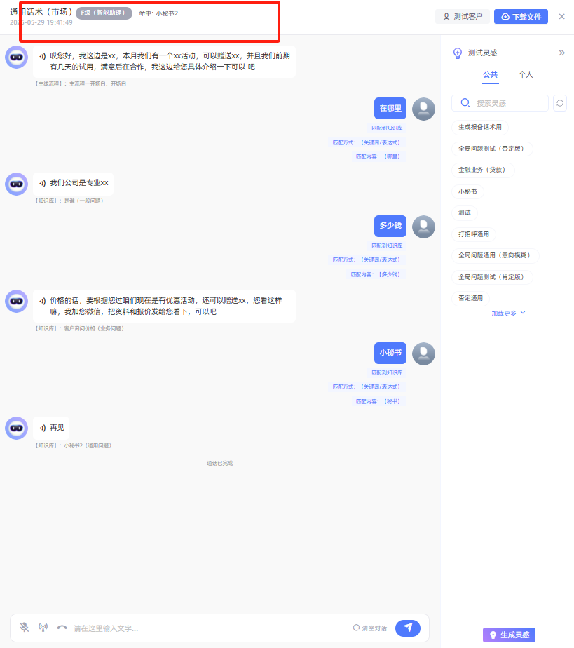这里的意向标签选择指的是,只要是命中当前知识库,不管对话过程中客户还说过什么,这个对话都是当前意向标签。比如小秘书打上F类,最后只要是触发到小秘书,不管客户前面说到什么这个通话都是F类。